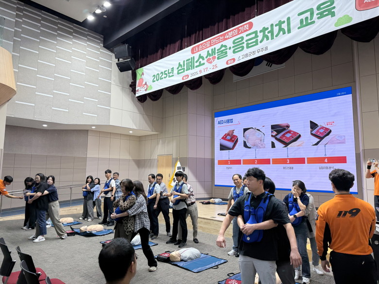 군청 우주홀에서 총 8회에 걸쳐 실시된 이번 교육은 전 직원을 대상으로 ▲심폐소생술 ▲자동심장충격기(AED) 사용법 ▲기도 폐쇄 응급처치 요령 등을 포함한 이론과 실습 병행형 프로그램으로 운영됐으며, 1,000여 명이 수료했다.