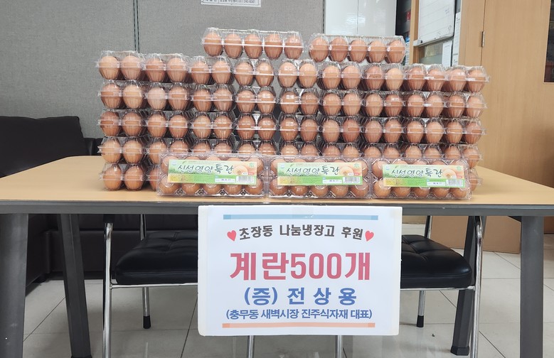 [서구 세계타임즈=이용우 기자] 부산 서구 초장동주민센터(동장 이명희) 나눔 냉장고에 지난 3월 7일 충무동새벽시장 전상용(진주식자재 대표)님이 20만 원 상당 계란 500개를 기부하였다. 전상용 대표는 2024년 9월부터 김 세트, 백미, 두부 등 식료품을 기부하며 꾸준하게 이웃사랑을 실천하고 있다.
