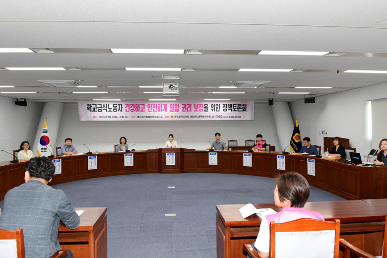 이번 토론회에는 광주시의회 새로운노동특별위원회와 전국학교비정규직노동조합 광주지부가 공동 주최하여, 신명근 광주전남노동상담소 노무사, 최민 한국노동안전보건연구소 직업환경전문의가 발제하고, 이재진 전국학교비정규직노동조합 노동안전국장, 이철갑 조선대 직업환경의학전문의, 김양지 대반초 학부모 회장, 교육청 관계자가 토론자로 참여했다.