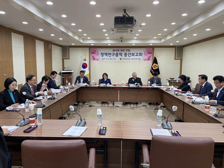 [대구 세계타임즈=한성국 기자] 대구시의회 의원연구단체 ‘새시대 희망 포럼(이하 ‘포럼’)‘(대표 황순자 의원)은 10월 24일(화) 오후 2시 의회 3층 회의실에서 소속단체 의원(대표 황순자, 간사 이성오, 김대현, 전태선, 박우근, 이재숙, 하중환, 정일균, 김재용, 윤권근, 김정옥, 박소영, 박창석, 육정미)이 참석한 가운데 ‘대구시 청년 일자리·주거정책 평가 및 개선방향 연구’ 용역 중간보고회를 개최했다.