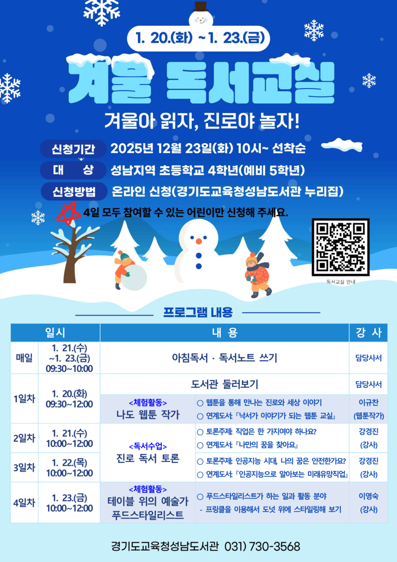 겨울방학 독서교실은 2026년 1월 20일부터 23일까지 4일간 성남지역 초등학교 4학년을 대상으로 운영된다.