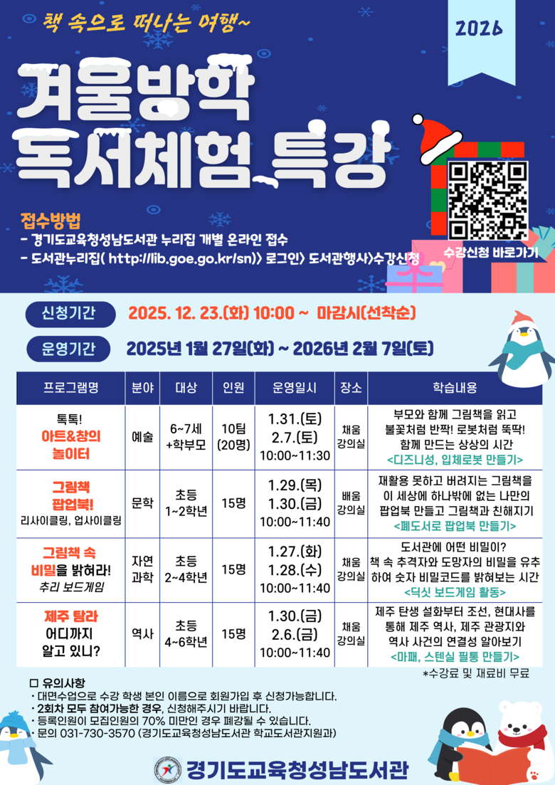 ‘겨울방학 독서교실과 겨울방학 독서체험 특강’의 참가자는 23일부터 경기도교육청성남도서관 누리집(https://lib.goe.go.kr/sn)을 통해 선착순으로 모집한다.