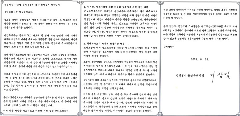 ▲ 이상일 용인특례시장이 지난 8월 13일 구윤철 기획재정부 장관에게 보낸 '용인 첨단시스템반도체 국가산업단지' 토지 수용 대상 가구에 불합리하게 적용되는 비과세 혜택에 대한 문제 해결을 요청하는 서한문.