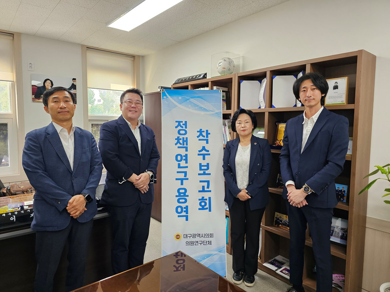 [대구 세계타임즈=한윤석 기자] 대구시의회 의원연구단체 ‘대구 미래 혁신 포럼’(대표 이재숙 의원)은 10월 2일(수) 오전 10시 30분, 시의회 3층 의원실에서 소속 의원(간사 김태우 의원)과 연구진 등이 참석한 가운데 정책 연구용역 착수보고회를 개최했다.