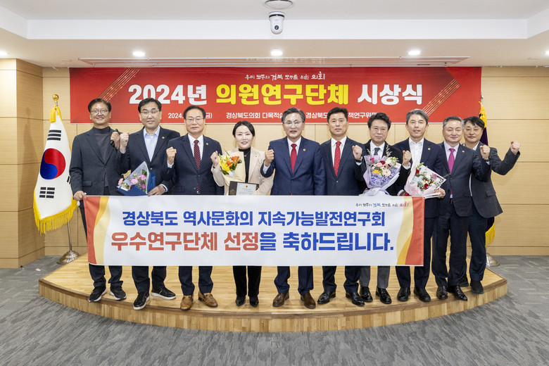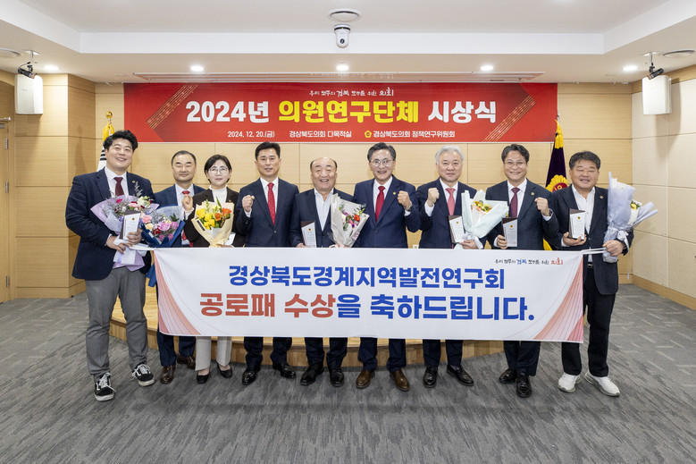 [경북 세계타임즈=한윤석 기자] 경상북도의회는 2024년 12월 20일(금) 의원연구단체의 연구 성과를 격려하는 시상식을 도의회 다목적실에서 개최했다. 이번 시상식에서는 「경상북도역사문화의지속가능발전연구회」(대표 정경민 의원)와 「교육거버넌스정책연구회」(대표 정한석 의원)가 2024년 우수의원연구단체로 선정되어 우수연구단체상을 수상하였으며, 「경상북도경계지역발전연구회」(대표 : 김홍구 의원)는 지난 2년간의 활발한 활동에 대해 공로패를 수상하였다.