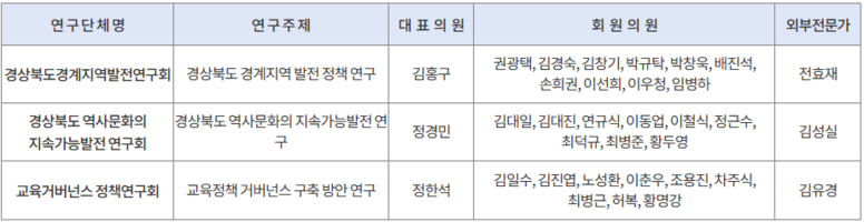 「경상북도경계지역발전연구회」는 경계지역이 가진 특수한 문제와 어려움을 해결하기 위해 경계지역 조례 발의, 사업 개발, 시·군 담당자 간담회 개최 등을 통해 정책적 대안을 제시하고자 노력해왔다. 이러한 지속적인 활동과 성과는 경계지역 주민들에게 실질적인 변화를 가져왔다는 점에서 높이 평가되었으며, 그 공로를 인정받아 공로패를 수상하였다.