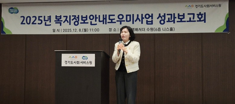 지난 8일, 수원시 팔달구 소재 이비스 앰배서더 수원 니스홀에서 <2025년 복지정보안내도우미 성과보고회>가 개최됐다. ‘복지정보안내도우미’ 사업은 경기도사회서비스원이 추진하는 현장 중심 복지 연계사업으로, 2024년 4개 시군에서 시범사업을 성공적으로 마쳤으며 올해는 고양·성남·안산·안성·부천·수원·남양주 등 7개 시군으로 확대해 본격 운영했다.