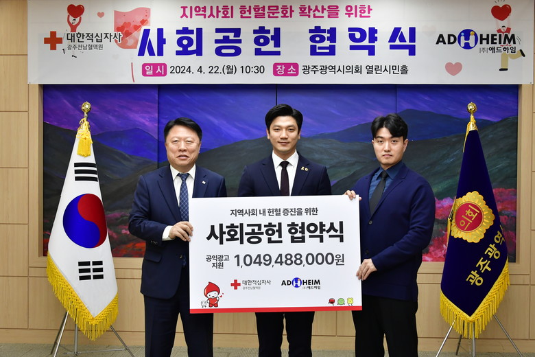 [광주 세계타임즈=손권일 기자] 대한적십자사 광주·전남혈액원은 ㈜애드하임과 22일 광주광역시의회 4층 열린시민홀에서 헌혈문화 확산을 위한 사회공헌협약을 체결했다고 밝혔다.