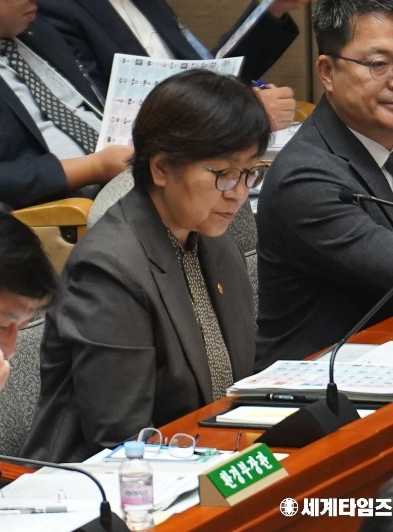 '정은경'보건복지부 장관이 25일 국회에서 열린 예산결산특별위원회 전체 회의에 참석해 관련서류를 검토하고있다.