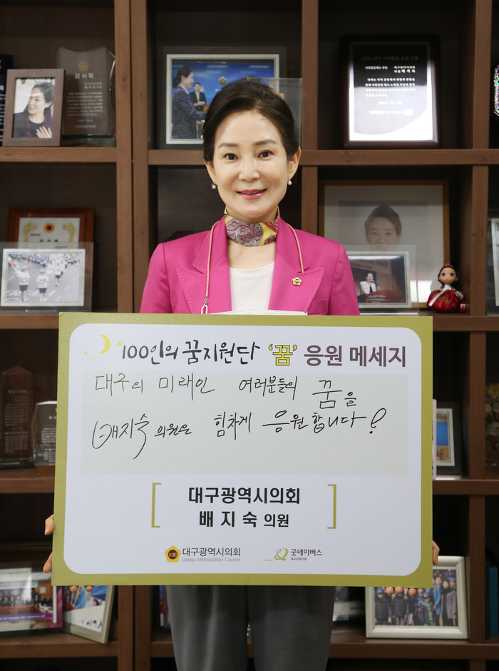 배지숙 의원은 “대구의 미래인 아동들의 꿈을 힘차게 응원한다”라고 적은 응원 메시지를 전하면서, “의정활동을 통해 우리 아이들이 꿈을 이룰 수 있도록 최선을 다해서 돕겠다”라며, “꿈 지원단뿐만 아니라 굿네이버스 등 많은 후원단체들과 함께 지역사회의 좋은 변화를 만들기 위해 노력하겠다”라고 밝혔다.