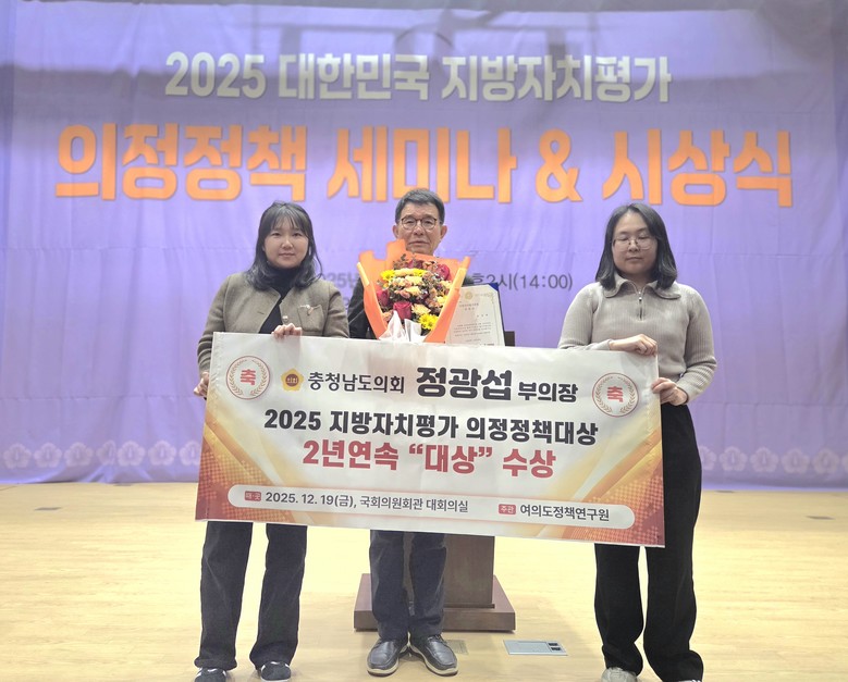 정광섭 부의장은 “2년 연속 대상 수상은 개인의 성과라기보다, 현장의 목소리를 함께 만들어주신 도민 여러분과 동료 의원들의 협력이 있었기에 가능했다”며 “앞으로도 초심을 잃지 않고, 도민의 삶을 바꾸는 실천 중심의 의정활동으로 충남 발전에 기여하겠다”고 수상 소감을 밝혔다.