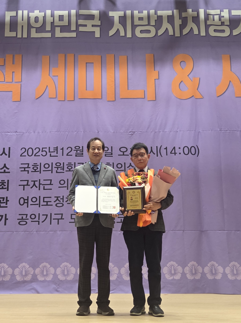 정 부의장은 지난 19일 국회의원회관에서 열린 시상식에서 여의도정책연구원이 주관하는 지방자치평가에서 최고상인 ‘대상’을 2년 연속 수상하는 영예를 안았다.