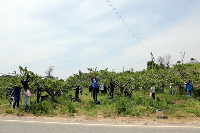 봉사활동 참가자들은 복숭아 농장주와 함께 복숭아 열매솎기 작업을 진행하며 농번기를 맞아 일손이 부족한 농가에 힘을 보탰다.