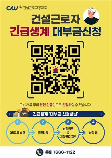 또 A 씨는 "대면으로 대출을 신청할 경우 긴 대기 시간 등 불편한 점이 있어, 이를 보완하기 위해 온라인으로 간편하게 신청할 수 있도록 했다" 고 말했다. 대출을 희망하는 건설근로자는 포스터의 QR 코드를 통해 모바일로 간편하게 신청할 수 있으며, 별도의 서류 제출은 필요 없다.