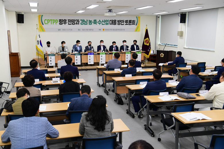 [경남 세계타임즈=최성룡 기자] 경상남도의회 의원 연구단체인 경남농업미래포럼연구회(회장 예상원 의원)는 9월 27일 경상남도의회 대회의실에서 포괄적·점진적 환태평양경제동반자협정(CPTPP) 체결 대비 경상남도 농·축·수산업 피해에 대한 분석과 대책을 마련하기 위해 토론회를 가졌다.