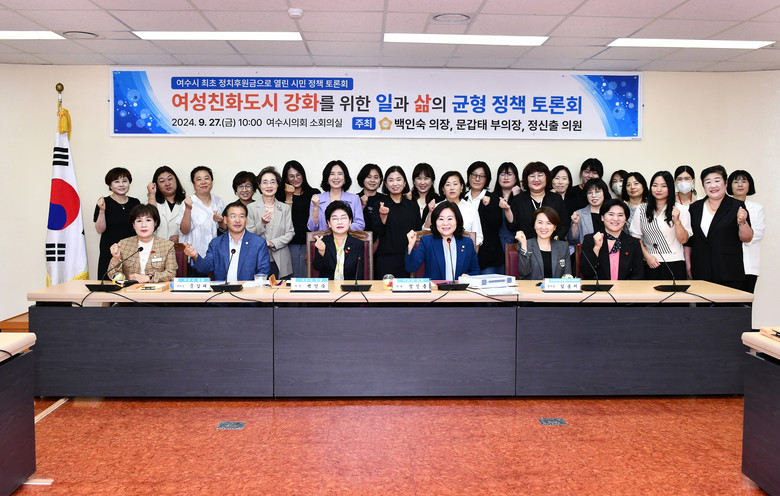 [여수시 세계타임즈=우덕현 기자] 여수시의회(의장 백인숙)는 지난 9월 27일 여수시의회 소회의실에서 ‘여성친화도시 강화를 위한 일과 삶의 균형 정책 토론회’를 성황리에 개최했다.