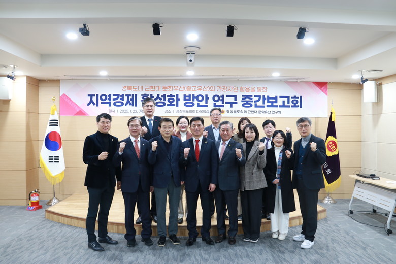 [경북 세계타임즈=한윤석 기자] 경상북도의회 의원연구모임인 「근현대 문화유산 연구회」(대표 김대일 의원)는 23일(목) 도의회 다목적실에서 “경북도내 근현대 문화유산(종교유산)의 관광자원 활용을 통한 지역경제 활성화 방안 연구”의 중간보고회를 개최했다. 이번 보고회는 대구대학교 산학협력단에 발주하여 지난 11월 착수된 연구용역의 추진경과 및 중간보고와 연구 전반에 대한 의견을 교환하기 위해 마련되었다.