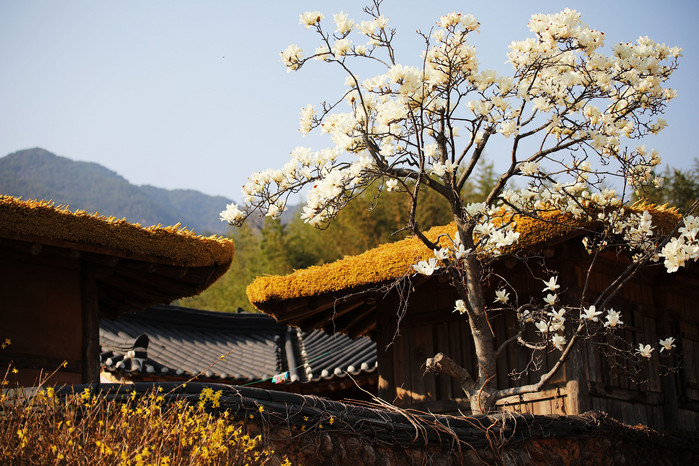 봄기운이 완연한 27일 대하소설 <토지>의 무대 하동군 악양면 평사리 최참판댁 인근 토지마을에 만개한 목련꽃이 초가지붕과 어우러져 아름다운 자태를 선보이고 있다.