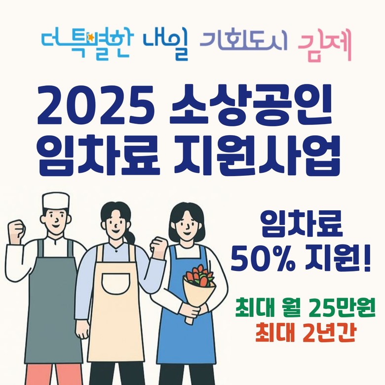 정성주 김제시장은 “임차료 지원사업은 소상공인의 자립을 돕고, 어려운 경영 여건 속에서 폐업을 방지할 수 있는 실질적인 정책”이라며, “앞으로도 소상공인 경영 안정을돕고, 지역경제 활성화에 힘쓰겠다.”고 밝혔다.