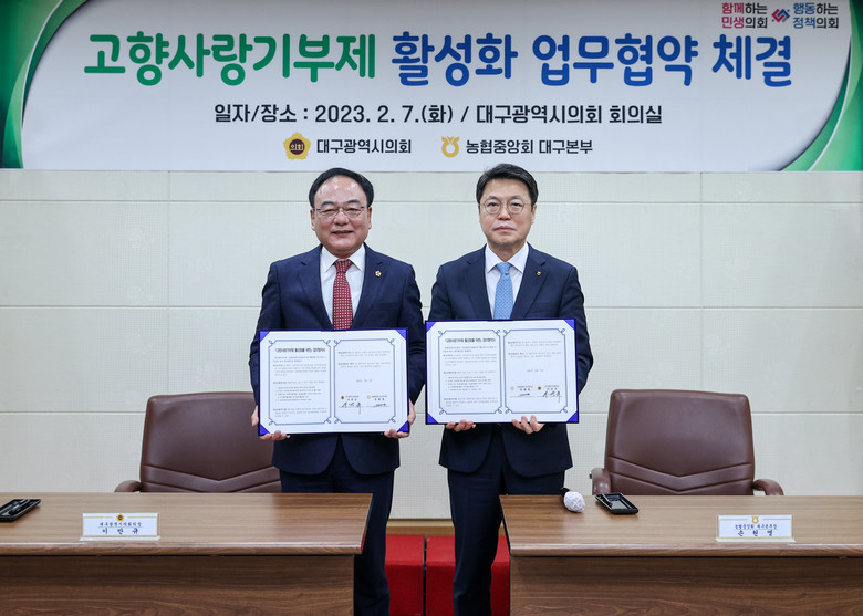[대구 세계타임즈=한성국 기자] 대구시의회는 2월 7일(화) 오전 10시 40분 대구시의회 3층 회의실에서 이만규 대구시의회 의장과 손원영 농협중앙회 대구본부장이 참석한 가운데 고향사랑기부제의 성공적인 정착을 위한 업무협약을 체결했다.