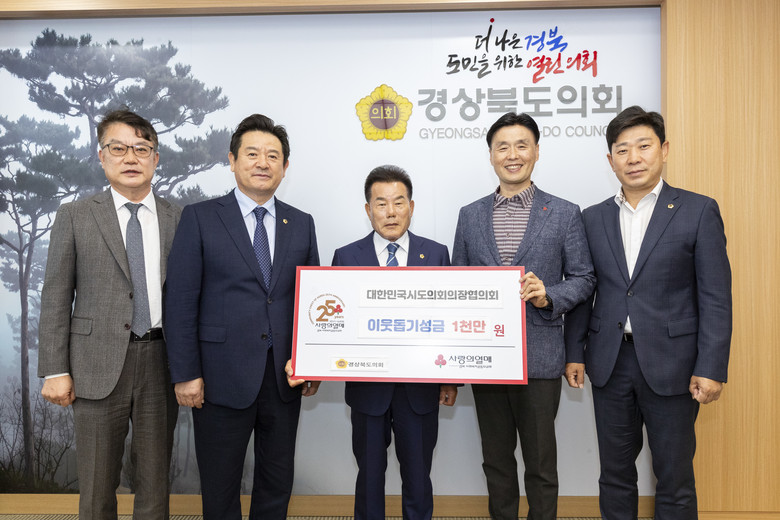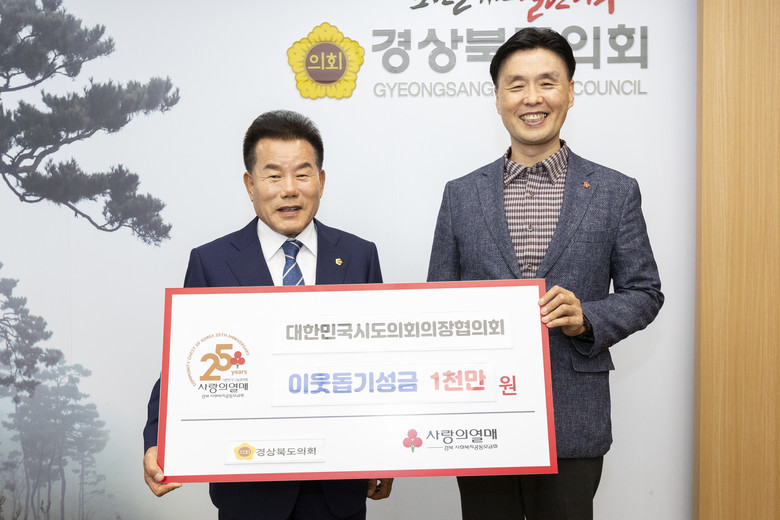 [경북 세계타임즈=한성국 기자] 경상북도의회(의장 배한철)는 10월 23일 도의회 의장실에서 대한민국시도의회의장협의회가 지원하는 집중호우피해 재난구호금 1천만원을 경상북도 사회복지공동모금회에 전달했다.