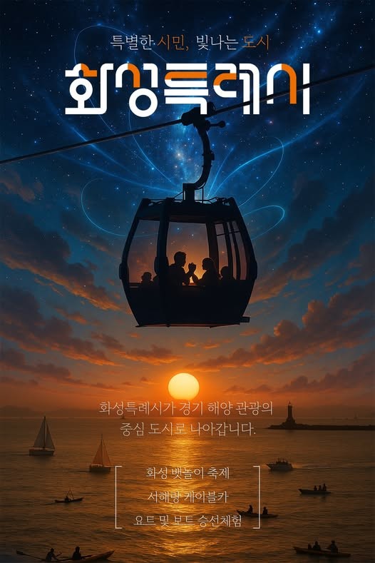 이미지 부문 대상으로는 김동균 씨의 ‘화성특례시가 경기 해양 관광의 중심 도시로 나아갑니다’가 선정됐다. 작품은 서해안의 낙조와 케이블카를 중심으로 서해안 해양관광도시로 나아갈 화성특례시의 비전을 상징적으로 담아냈다.