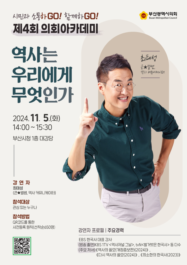 ◈ ‘역사는 우리에게 무엇인가’ 주제 강연으로 시민과 소통하는 열린의회 마련 [부산 세계타임즈=이용우 기자] 부산광역시의회(의장 안성민)는 11월 5일 오후 2시 부산시청 1층 대강당에서 최태성(큰★별쌤, 역사 커뮤니케이터) 강사를 초청하여‘제4회 의회아카데미’를 개최한다고 밝혔다.