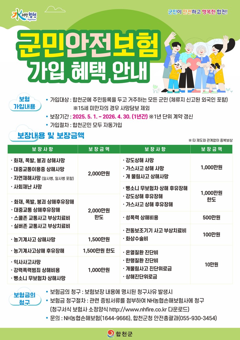 군민안전보험은 합천군에 주민등록을 둔 모든 군민(등록 외국인 포함)을 대상으로 불의의 사고로 인한 사망 및 후유장애 등 신체적 피해에 따른 보험금을 지급하는 제도이다.