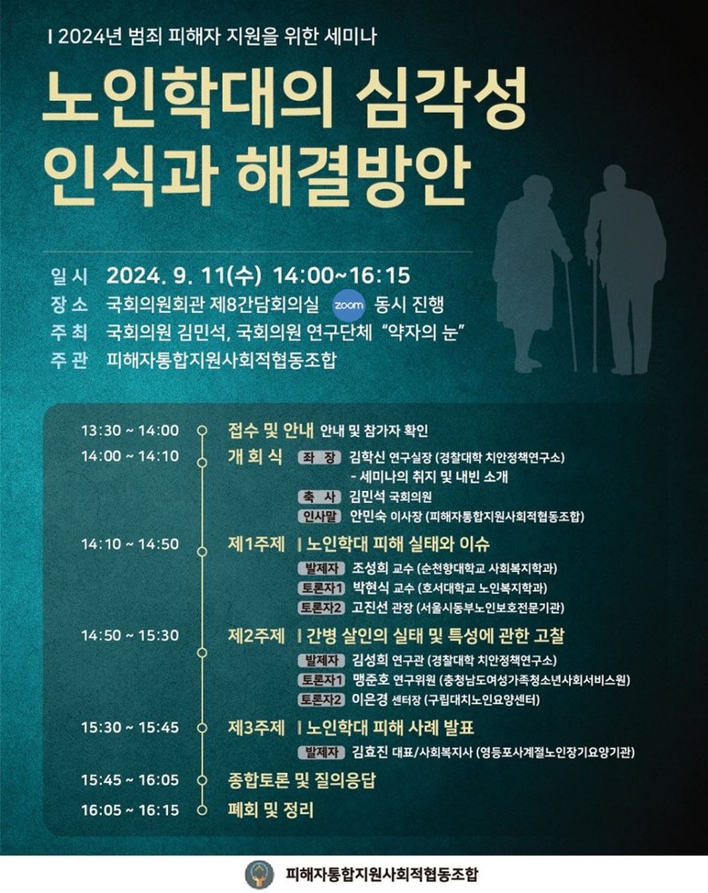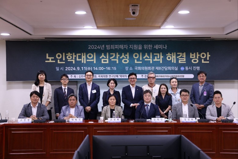 '2024년 범죄피해자 지원 세미나'가 지난 11일 국회의원회관에서 열려 노인학대의 심각성에 대한 논의가 진행됐다. 이 세미나는 2021년부터 매년 김민석 국회의원과 국회의원 연구단체 ’약자의 눈‘ 주최로’, 빅트리 피해자통합지원사회적협동조합에서 주관하여 개최된다.