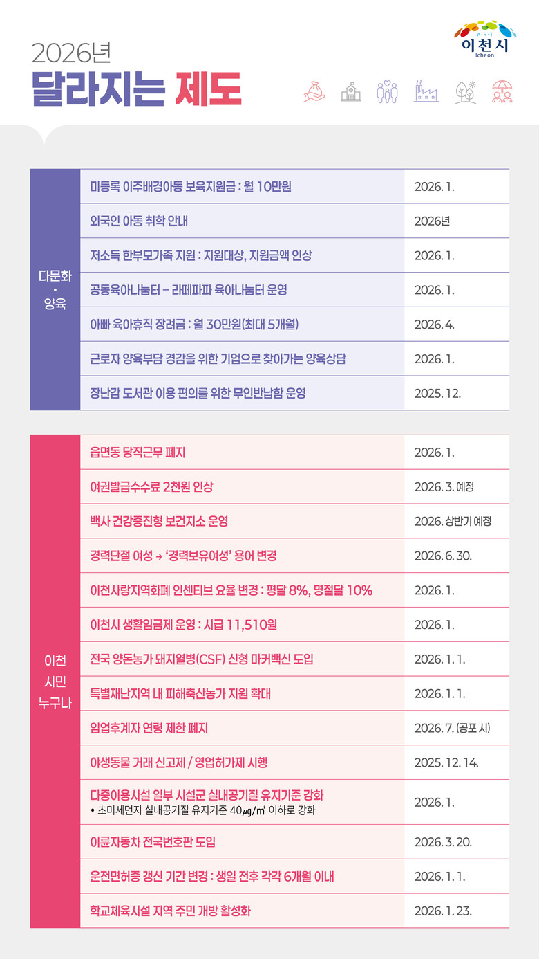 시는 이러한 내용을 담은 「2026년 달라지는 제도」 책자를 발간하여 시청과 읍면동 행정복지센터 민원실에 비치하고, 시 누리집(www.icheon.go.kr)에도 게시하여 시민들이 쉽게 확인하고 혜택을 누릴 수 있도록 적극적으로 홍보할 예정이다.