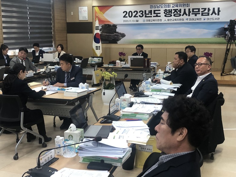 [경남 세계타임즈=최성룡 기자] 경상남도의회 교육위원회(위원장 박병영)가 13일 의령교육지원청에서 의령·함안 교육지원청을 비롯한 마산도서관, 미래교육원을 대상으로 행정사무감사를 진행했다. 이날 감사에서는 초중고 통폐합, 학교폭력심의 등 각종 현안에 대한 질의와 점검이 이어졌다.