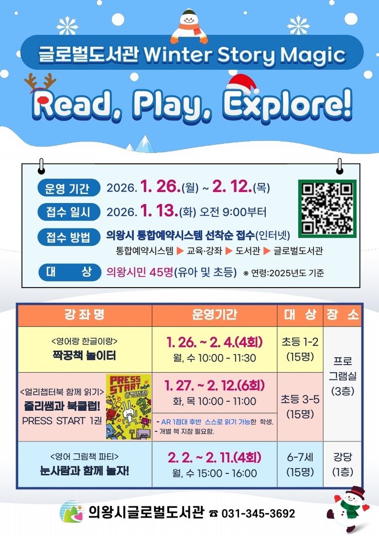 이번 프로그램의 신청은 1월 13일 오전 9시부터 의왕시 통합예약시스템에서 선착순으로 진행되며, 프로그램 세부 내용 등 기타 관한 자세한 사항은 의왕시 글로벌도서관 홈페이지 공지 사항에서 확인하거나 글로벌도서관(☎031-345-3692)으로 문의하면 안내받을 수 있다.
