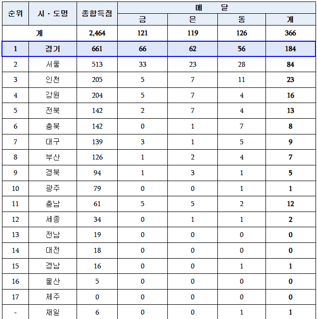 개막 하루 전인 24일, 경기도선수단은 밀라노코르티나 동계올림픽 관계로 사전경기로 진행된 빙상 스피드·쇼트트랙 점수에 이날 치러진 아이스하키와 컬링 종목 점수를 더하며 종합득점 661점, 메달수 184개(금 66, 은 62, 동 56)로 시도별 종합순위 1위를 기록하고 있다.