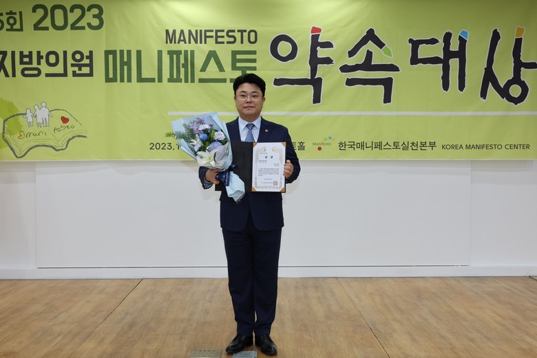 사단법인 한국매니페스토실천본부가 주관하는 ‘2023 매니페스토 약속대상’은 지역 발전과 주민 복지 증진, 공약 우수사례 발굴과 확산을 위해 전국 지방의원을 대상으로 공약 이행과 좋은 조례 분야로 나눠 매년 수상자를 선정해 왔다.