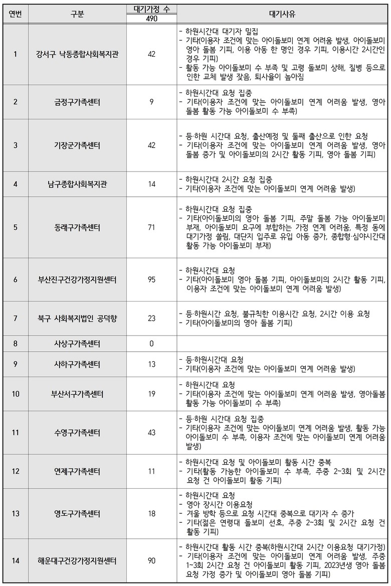 이 의원은, “본 의원이 어제, 부산시내 아이돌봄 제공기관 14개 중 다섯 기관에 직접 전화하여 아이돌봄 서비스를 신청해보았으나, 다섯 기관 모두 이미 예약이 꽉 차서 신청이 불가하다는 답변을 받았다.”라며 “이는 지난 11월, 본 의원이 아이돌봄 서비스를 신청해봤던 다섯 기관과 다른 다섯 기관에 전화를 걸어본 결과로, 해가 바뀌어도 아이돌봄 대기 실태는 여전히 심각함을 확인하였다.”라고 설명했다.