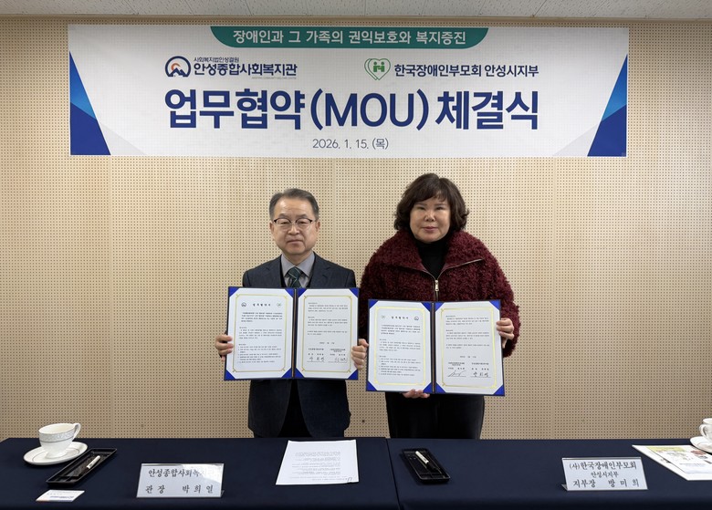 [안성시 세계타임즈=송민수 기자] 안성종합사회복지관(관장 박희열)은 지난 15일 (사)한국장애인부모회 안성시지부(지부장 방미희)와 장애인·가족 권익 보호 및 복지 증진을 위한 업무협약(MOU)을 체결했다.