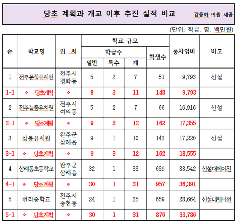 강 의원에 따르면, 올해 전북에서 개교한 곳은 유치원 3개원, 초등학교 1개교, 중학교 1개교로, 이중 계획된 학급수와 학생수를 충족한 곳은 단 한 곳도 없는 것으로 나타났다.