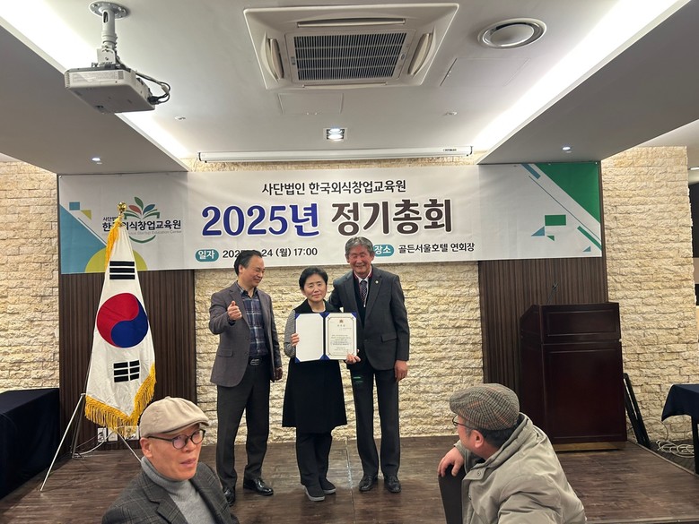 ● 2024년 외식산업 발전 공로 감사장 수상자▶ 김용호 이사, 이규한 이사 ● 2025년 대한민국 외식산업 발전 공로상▶ 주정자 부이사장, 김희순 위원장외식산업의 발전을 위해 오랜 기간 헌신해 주신 공로에 깊은 감사를 드리며, 앞으로도 더 큰 비전과 사명감으로 대한민국 외식업계를 빛내 주시리라 믿는다.