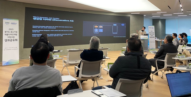 | ▲지난 10일 경기스타트업브릿지에서 열린 ‘2025 중소기업 제품디자인개발 지원사업’ 성과공유회’에서 최종우 한양대 교수가 ‘AI를 활용한 기업의 제품디자인 향상 스킬’을 주제로 특강을 하고 있다.(사진=경과원) |