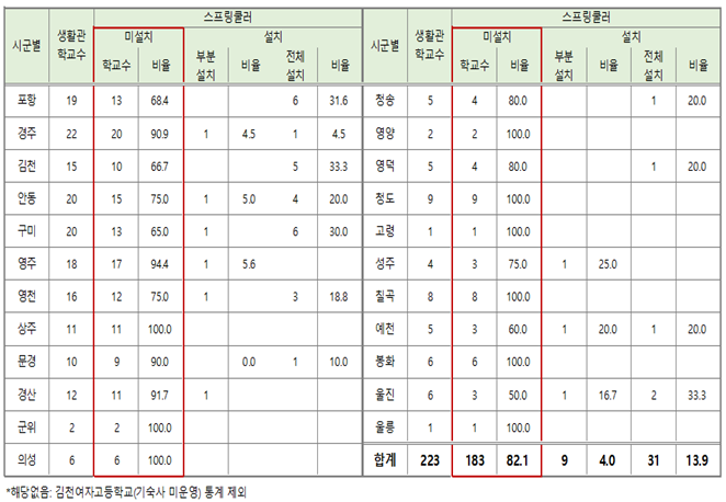 시군별로는 기숙사 운영학교 전체(100%)가 스프링클러를 설치하지 않는 곳은 상주, 군위, 의성, 영양, 청도, 고령, 칠곡, 봉화, 울릉이고 90% 이상 설치하지 않는 경우는 경주, 영주, 문경, 경산이 있었다.