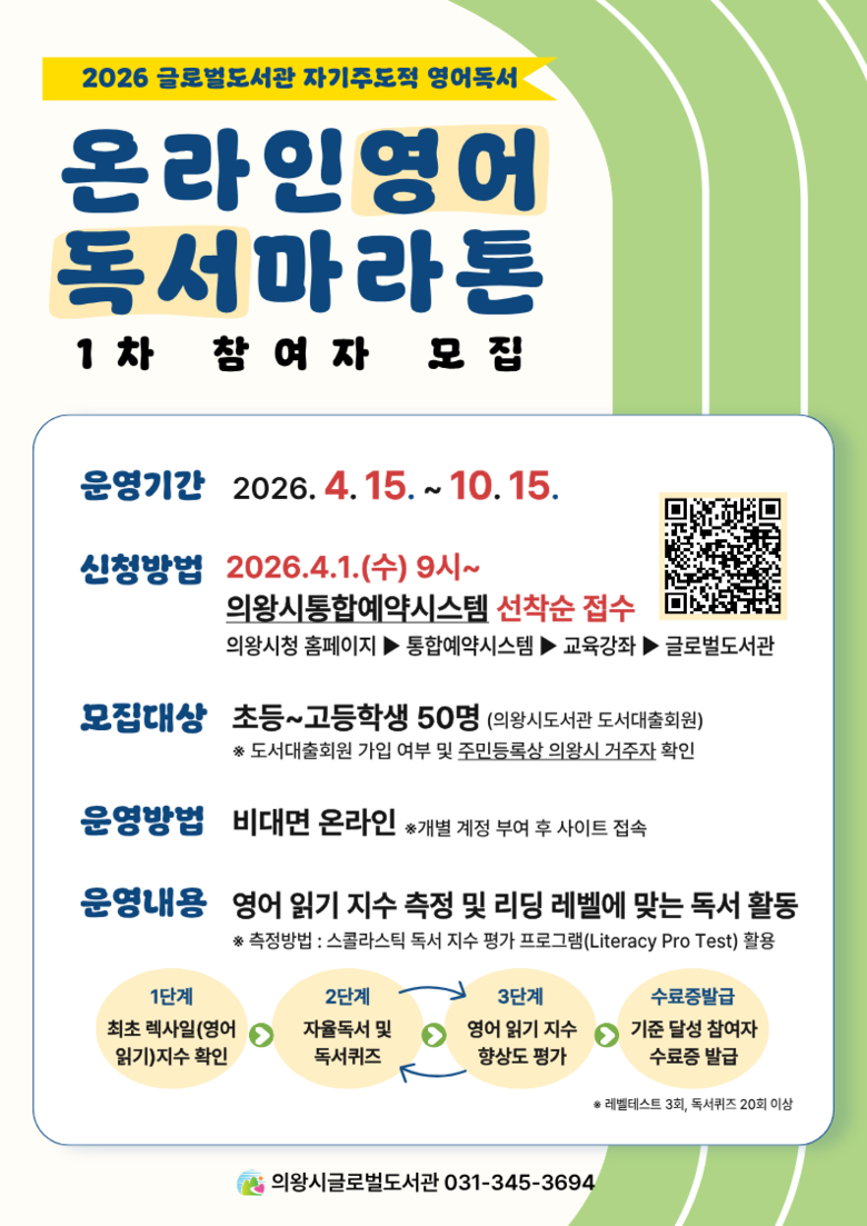 [의왕시 세계타임즈=송민수 기자] 의왕시(시장 김성제) 글로벌도서관은 학생들의 영어 독서 흥미를 높이고 자기주도적 학습 습관 형성을 지원하기 위해 기획된 「온라인 영어독서마라톤」의 1차 참여자 50명을 모집하고 있다.