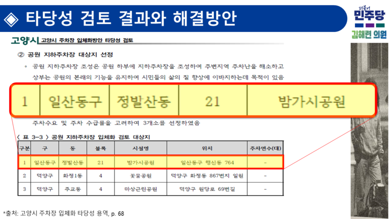 이어 “2025년 4월 완료된 ‘고양시 주차장 입체화방안 타당성 검토 용역’에서도 정발산동 밤가시공원은 화정동 꽃물공원, 주교동 마상공원과 함께 공원 지하주차장 조성 대상지로 선정되는 등 우선순위 상위권에 올랐다”면서, “지하 1층 규모로 102면을 확보할 경우, 현재 421대에 달하는 불법주차 문제를 약 24% 해소할 수 있을 것”이라고 설명했다.