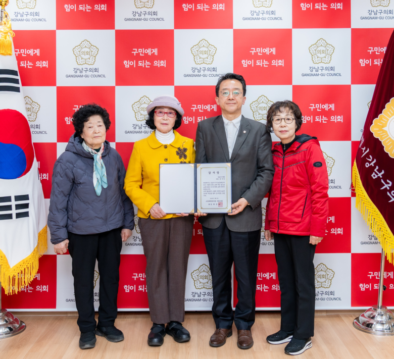 [강남구 세계타임즈=이장성 기자] 서울시 강남구의회 윤석민 의원(국민의힘, 재선·개포1‧2‧4동)은 5일 오후 강남구의회 의원연구실에서 월남참전 고엽제 미망인와 월남참전 고엽제후유의증 미망인회로부터 보훈 가족의 복지 증진에 기여한 공로로 감사장을 받았다.