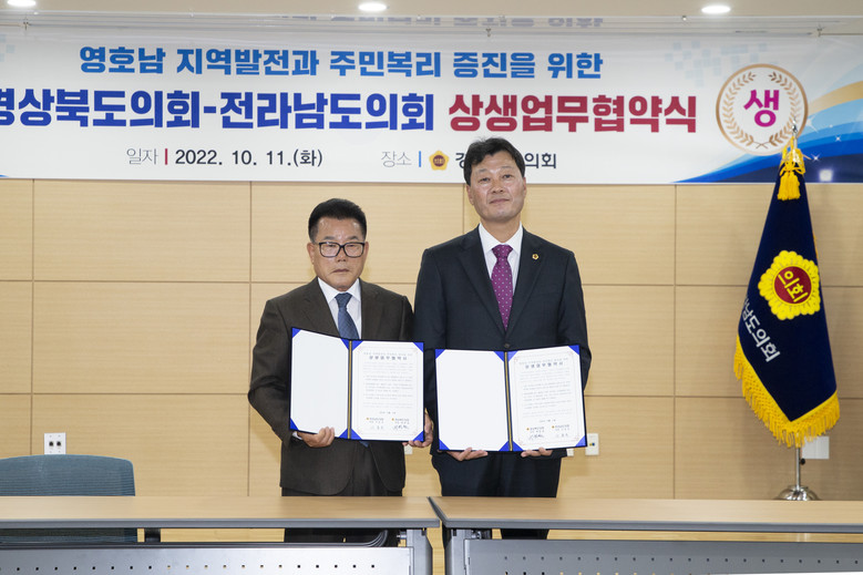 [경북 세계타임즈=한성국 기자] 경상북도의회(의장 배한철)는 지역 현안의 조속한 해결과 영호남 공동 번영의 기틀을 마련하기 위해 11일(화) 전라남도의회와 상생업무협약을 체결했다.