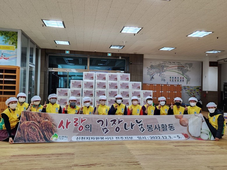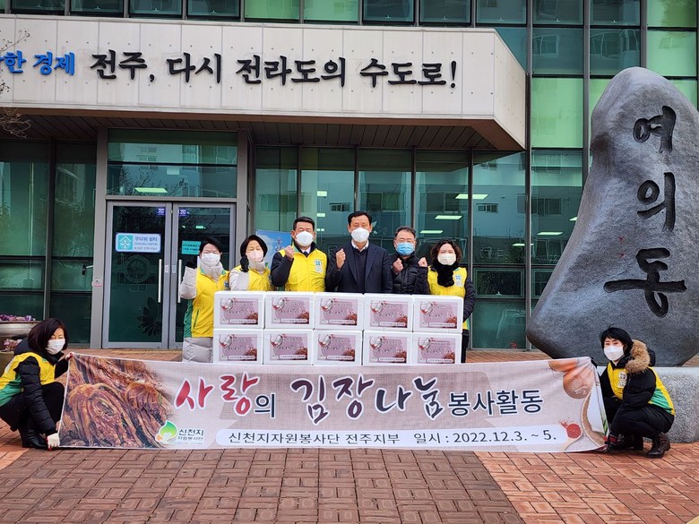 [세계타임즈 = 전영숙 기자] 신천지자원봉사단 전주지부(이하 신자봉 / 지부장 최중일)에서 지난 5일 전주시 필복동, 여의동사무소와 전주지역아동센터, 한국장애인교통문화협회에 김장김치 40박스(600kg)를 전달했다.
