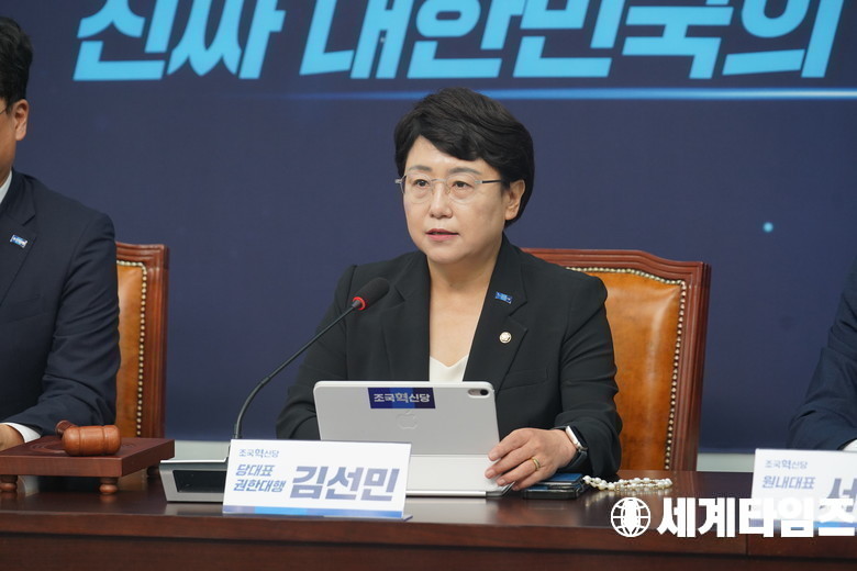 조국혁신당 '김선민' 당 대표 권한대행이 26일 서울 여의도국회의사당에서 열린 최고위원회의에서 발언하고 있다.