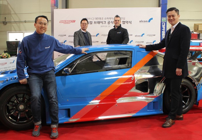 [사진설명]테크니컬 브레이크 공식 후원 협약식에 참석한 알렉스 휴이 알콘 아시아 총판 대표이사, 정도영 ㈜슈퍼레이스 제휴사업본부장, 벤 에드워즈 영국 알콘 본사 총괄이사, 김주환 ㈜에스에스에프 대표(왼쪽부터)가 슈퍼 6000 클래스에 나서는 스톡카와 함께 기념촬영하고 있다.