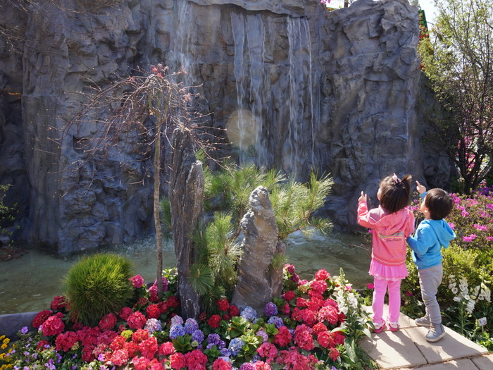 세계 꽃들의 환상적인 하모니 ‘2018고양국제꽃박람회’가 오는 13일까지 고양시 호수공원에서 개최된다. 박람회장을 방문한 꼬마 관람객들은 시원하게 떨어지는 폭포가 마냥 신기하다. 사진 속 폭포는 ‘생명과 평화의 정원’ 속 ‘여신의 폭포’로 생명 잉태와 사랑의 상징으로 제작됐다.