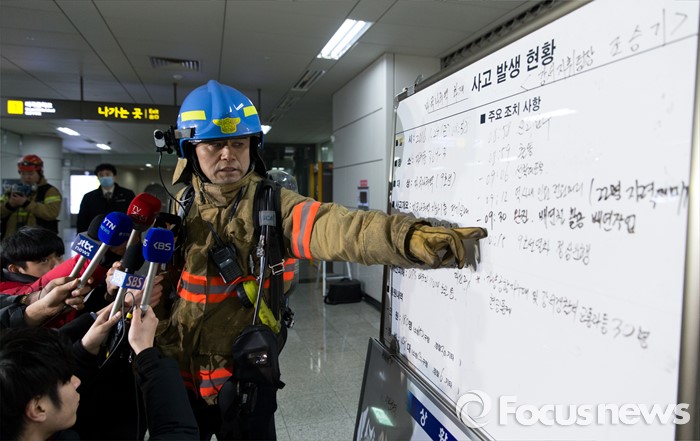 (서울=포커스뉴스) 29일 오전 서울 강서구 지하철 9호선 마곡나루역에서 조승기 강서지휘팀장이 역 지하 기계실에서 발생한 화재에 관련된 브리핑을 하고 있다.