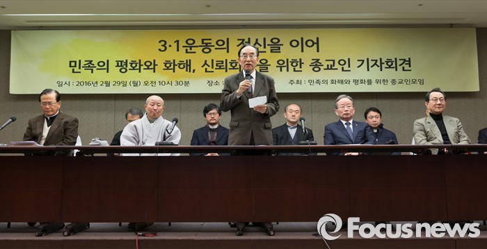 (서울=포커스뉴스) 29일 오후 서울 중구 프레스센터에서 '3.1 운동의 정신을 이어 민족의 평화와 화해, 신뢰회복을 위한 종교인 기자회견'에 참석한 김명혁 한국복음주의협의회 회장이 인사말을 하고 있다.